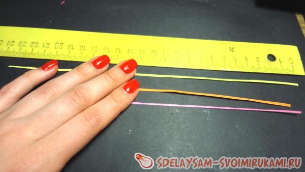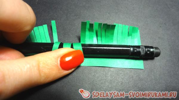 25.Робимо крапельки-квіточки, для цього рожеву смужку розрізаємо навпіл, і скручуємо з неї рол, після чого сплюснем пальцями по краях.