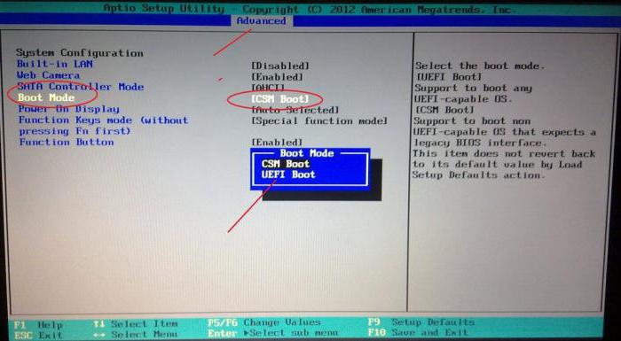 Далі попередня настройка Windows-інсталяції не може обійтися без входу в розділ розширених налаштувань (Advanced), де необхідно знайти рядок System Configuration, а потім встановити параметр режиму завантаження Boot Mode в положення CSM Boot або CMS OS замість початкового параметра UEFI OS (UEFI Boot). Як вже зрозуміло, це як раз таки безпосередньо стосується нових версій BIOS.