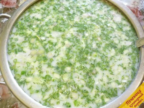Дрібно порізати зелену цибулю і кріп, викласти в каструлю до решти продуктів.