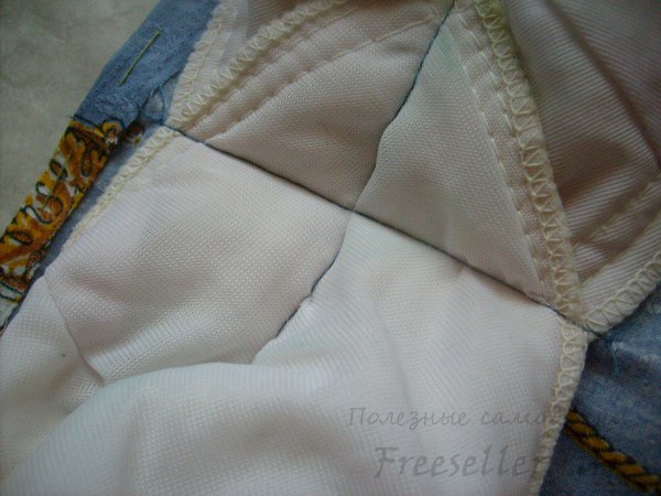 7. Складаємо джинсову і х/б деталі разом виворотом усередину і зшиваємо їх по всьому периметру, заклавши посередині однієї з бічних сторін бантик з мотузки.