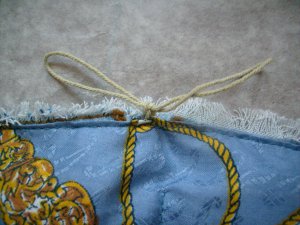Крім зрізаних зі старих джинсів кишень, ми використовували шматок х/б тканини в тон, пару старих підплічників, фрагмент тонкої мотузки довжиною близько 15 см, нитки швейні приналежності.