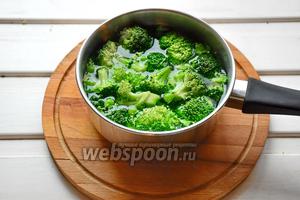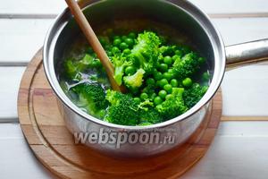Зелений горошок і брокколі опустити в киплячу воду і бланшувати кілька хвилин. Злиту воду зберегти, а овочі облити холодною водою, щоб зберегти колір.