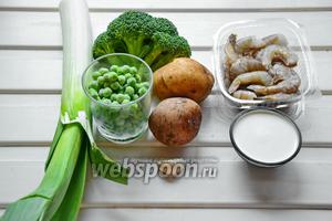 Інгредієнти: цибуля-порей, брокколі, картопля, часник, вершки, зелений горошок, креветки тигрові, сіль, перець за смаком.