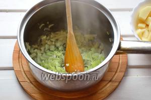 Цибулю-порей і часник обсмажити в олії до м’якості.