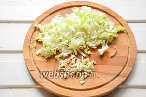 Цибулю наріжемо на тонкі смужки, часник дрібно нашинкуем.