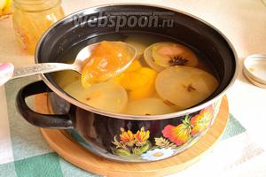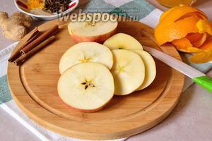 Апельсинові кірки, яблука, спеції, імбир і цедру покласти в каструльку і залити холодною водою. Довести до кипіння і варити під кришкою, на повільному вогні близько 40 хвилин.