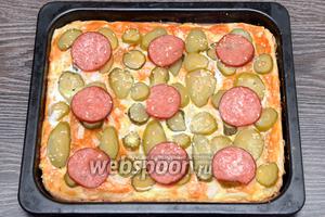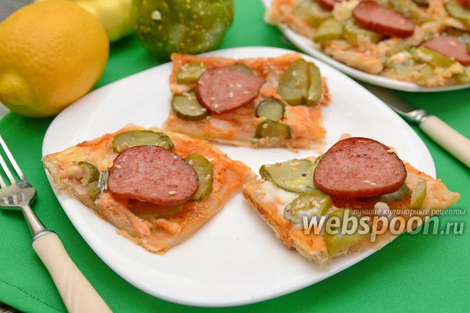 Не знаєте чим здивувати велику компанію друзів? Цей варіант відмінно підійде для дружньої компанії. Закуска з ковбасою, кунжутом і огірками — практично як піца, а готується набагато простіше, не треба розкачати коло, достатньо лише розкачати тісто за формою дека і використовувати всі звичні продукти.