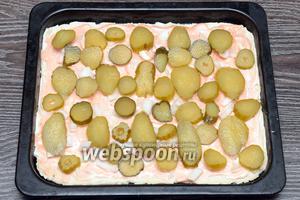 Змащуємо тісто сумішшю з майонезу та кетчупу.