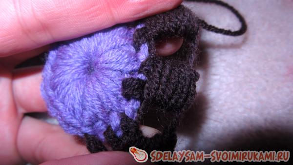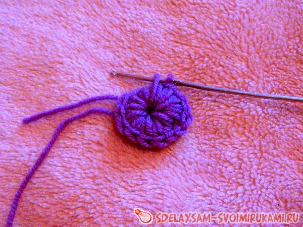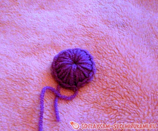 Ряд закінчуємо з’єднувальним стовпчиком. Пров’язуємо одну петлю підйому, і знову вводимо гачок у центр першого гуртка, в’яжемо по колу, «нарощуючи» обсяг виноградинки.