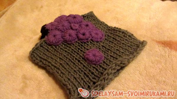 Снуди, шарфи, шалі, накидки та інші неодмінні аксесуари холодного часу року одно вживаються в моді. Виділитися з натовпу, привернути до себе увагу світських левиць і залишитись неповторною допоможе «родзинка», вірніше, ціла гроно винограду, в дизайнерському скороченому шарфі з об’ємною аплікацією, що поєднує відразу кілька технік в’язання. Модель проста, але ефектна і практична, бо грона винограду розташовані таким чином, щоб частково прикривати від морозу щоки і вушка щасливої власниці.