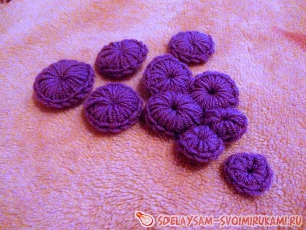 В цілому нам знадобиться від 6 до 10 «виноградинок» для одного грона. Вони можуть бути як симетричні, так і асиметричні. У своїй роботі я зв’язала додатково три «ягідки» і розташувала їх симетрично по відношенню до основної аплікації. «Виноградники» зшиваємо між собою голкою, на шарфі маємо в довільному порядку.