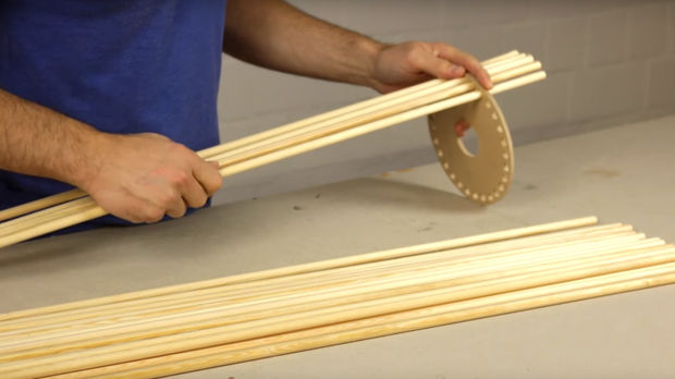 7. Збираємо лампу. Спочатку відгвинчуємо фіксуюче кільце з патрона, вставляємо патрон в першу круглу деталь по центру, загвинчуємо і затягуємо кільце. Далі в малі отвори по периметру тієї ж деталі вставляємо круглі дерев’яні палички так, щоб над дошкою залишалися кінчики палиць довжиною 10 см. Фіксуємо палиці в отворах хорошим клеєм для дерева (або клей не використовуємо, а лише зверху надягаємо на всі палки широке гумове кільце на кроці 8 – автори майстер-класу стверджують, що все буде прекрасно триматись на одному кільці).