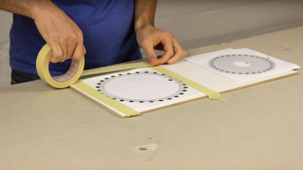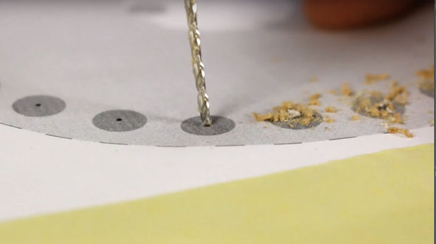 3. Фіксуємо свердло 3 мм і починаємо акуратно свердлити по точках, не сильно давлячи на лист спресованого дерева, щоб не пошкодити короткі перемички між отворами. Найзручніше свердлити, якщо покласти ваш лист з шаблоном на непотрібну дошку або стос газет. Спочатку просвердлюємо на проколотих точках невеликі поглиблення 3-х міліметровим свердлом, потім вставляємо 10-ти міліметрове і досверливаем отвори їм. Не забуваємо зробити малий отвір збоку внутрішнього великого кола по центру шаблону.