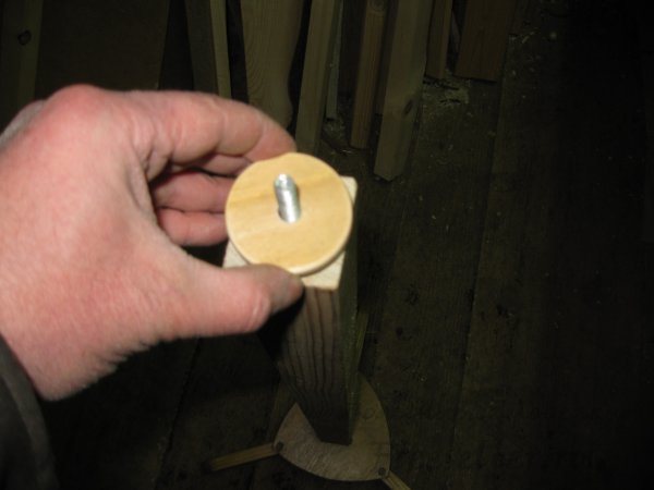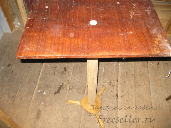 Для цього знімаємо з підставки столик і спочатку встановлюємо на шпильку стійки фанерну гайку.