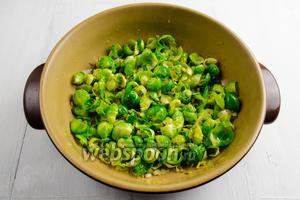 Капуста брюссельська 400 гОлія оливкова зі спеціями 3 ст. л.Сік лимонний 2 ст. л.Сіль 1 щіпкаСир Пармезан 10 гЧасник 2 зубчик