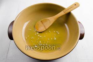 Часник очистити. Часточки дрібно нарізати шматочками. Поставити на малий вогонь сковороду з оливковою олією і часником. Обсмажити 2 хвилини, поки часник трохи карамелізується.