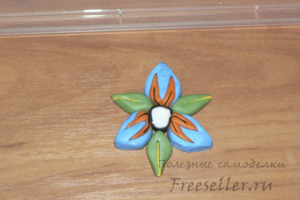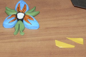 Надрізаємо їх і вставляємо жовті пластинки. Приєднуємо листочки до бутону.