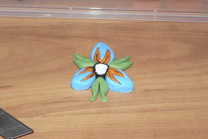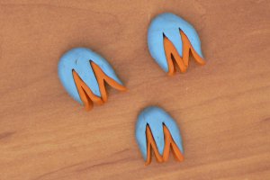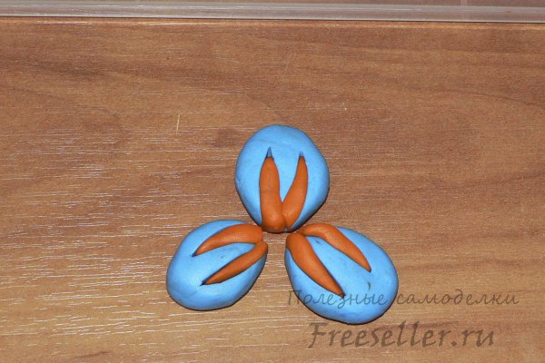 Візьмемо зелену полімерну глину і виліпив спочатку кульки, а потім три краплі побільше тих, що робили з блакитний полимерки. Це будуть чашолистки нашого бутона.