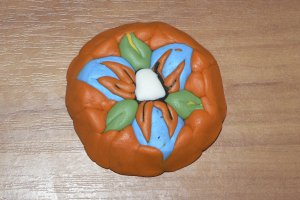 Скачаємо білу кульку і расплющим його – це майбутня серединка квіткової композиції. Обернем серединку чорним тонким шаром пластики.
