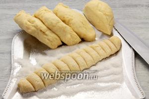 Для зручної формування нашого майбутнього печива, великий ком ділимо на кілька частин, кожну з яких витягуємо, потім прокатуємо в цукровому піску — густо паніруємо з усіх боків.
