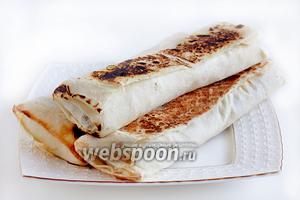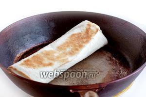 Обсмажити отриману шаурму на сухій чавунній сковороді або на металевому аркуші з двох сторін до потрібної вам ступеня рум’яності.