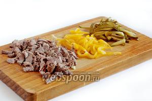 Шматочки шашлику, солодкий перець і огірки нарізати соломкою.