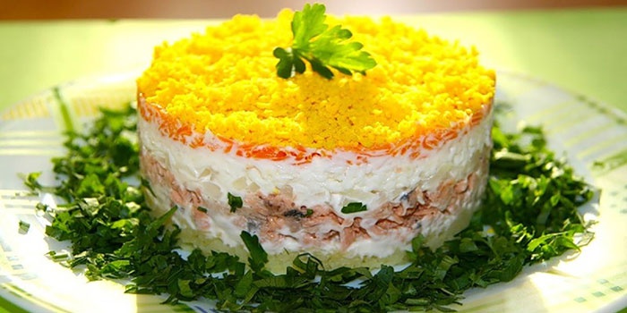 - Зверху поміщається подрібнене за допомогою вилки філе тунця.