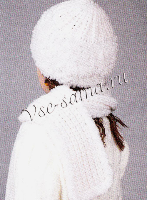 Гачком № 3 пряжею білого кольору зв’язати ланцюжок з 24 в. п. і в’язати гумкою 2 на 2. На висоті 120 см від набірного краю закінчити роботу. По колу шарфа пряжею «хутро» виконати 2 ст. б/н.