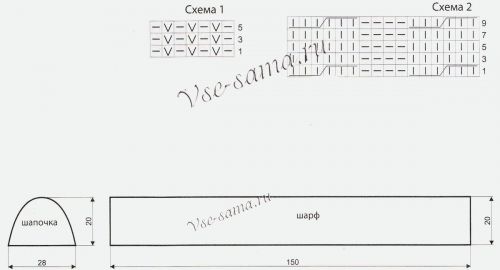 Набрати 42 п. і в’язати за схемою 2. На висоті 1 6 см від набірного ряду для освіти денця шапочки закрити рівномірно по всьому полотну 3 рази по 12 п. На висоті 20 см від набірного ряду петлі закрити.