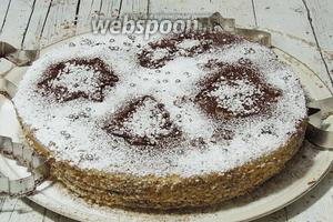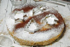 Кладемо на торт будь-які форми і обсипаємо какао і пудрою.