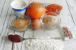 Підготуємо інгредієнти: борошно і лісовий горіх в крихті, тростинний цукор і цукрову пудру, пряникові спеції і какао, апельсини (для цедри потрібен 1 апельсин) і 250 мл соку, гіркий апельсиновий конфітюр з цукатами, крем-фреш або базарну сметану (35% жирності), яйця, пластини желатину.