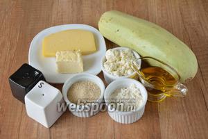 Кабачок 1 шт.Олія соняшникова рафінована 50 млМасло вершкове 50 гБорошно пшеничне другого сорту 2 ст. л.Панірувальні сухарі 2 ст. л.Перець чорний мелений 2 щіпкиСіль 2 щіпкаСир твердий 60 гСир 180 г