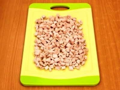 Нарізаємо кубиками курячу грудку. Грудку краще не варити, а запекти в духовці, тоді м’ясо буде більш цілісним. Дрібними кубиками ріжемо солоні огірочки.