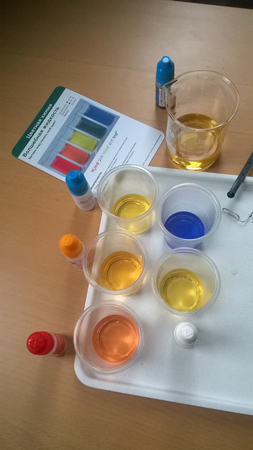 Вирішили діяти з отриманим кольором. Як не дивно, червоний, помаранчевий і жовтий він перетворився, зеленого не вийшло, а в останньому стаканчику несподівано виник той самий синій, колір індикатора. Тобто та кислота, що ми ненароком виявили у водопровідній у воді, прореагувала з карбонатом натрію і вийшов нейтральний розчин, так чи що?