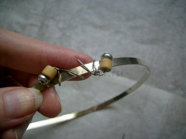 3. Загинаємо верхівку гвоздика з намистинами поверх обідка. Другий гвоздик кріпимо симетрично таким же чином.
