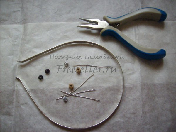 Крім самого обідка, нам знадобилися біжутерні гвоздики, намистини різного розміру і фактури. Працювати будемо пассатижами. Дизайн можна придумати заздалегідь. Ми ж вибрали найпростіший його варіант.
