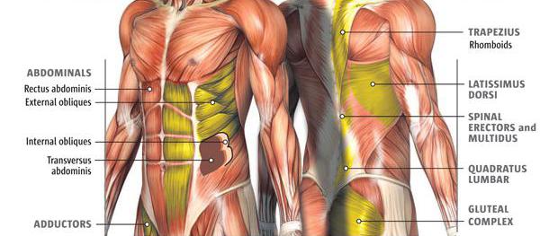 Спереду, у верхній частині, по площі покриття лідирують великі грудні м’язи. В області живота це глибоко залягає і тонка поперечна м’яз. Саме вона протистоїть гравітації і підтримує сталість внутрішнього середовища черевної порожнини. Разом з пресом забезпечує площину живота.