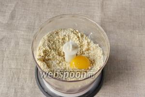 Перекручуємо все до однорідної крихти. Потім додамо 1 курячий жовток, білок прибираємо в холодильник, він нам знадобиться для прикраси.