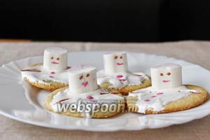 Наносимо на печиво білковий крем, нерівномірно, ніби розтанув сніг, потім робимо голову сніговика з допомогою зефіру маршмеллоу.