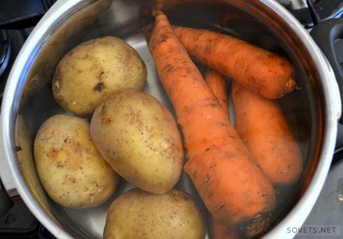 Відварити моркву і картоплю в мундирі близько півгодини. Викласти на тарілку, остудити.