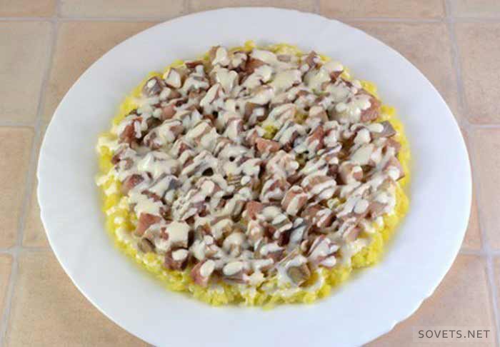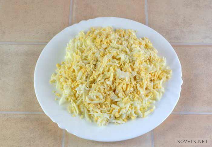 Рівним шаром викласти терті яйця, полити їх майонезом.