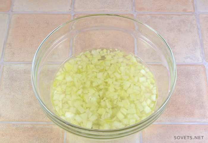 Очистити і дрібно нарізати цибулю. Викласти в глибоку миску і залити окропом для видалення різкого запаху і яскраво вираженої гіркоти.