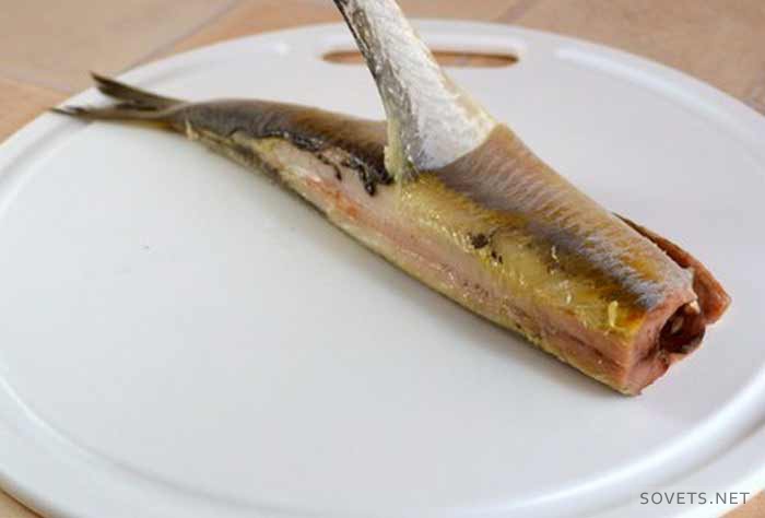 Розділити оселедець на дві частини, надрізавши уздовж спини. Вийняти хребет і всі кісточки (для зручності можна скористатися пінцетом).