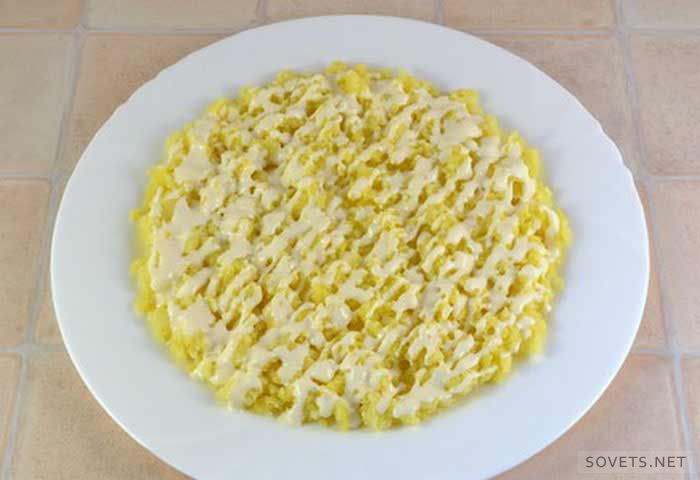 Викласти на велике блюдо шар тертої картоплі, змастити його майонезом.