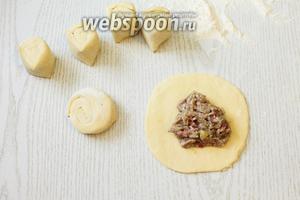 Кожен шматочок розгортаємо в коржик. Викладаємо начинку.