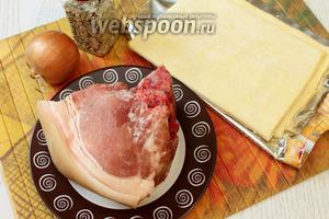 Для приготування нам знадобляться свинина, тісто листкове, сіль, цибуля ріпчаста, вода, кунжут, яйце куряче та приправа до м’яса (у мене суміш з коріандром).