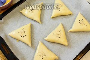 Готові пиріжки викладаємо на пергамент швом вниз. Змащуємо збовтаним яйцем і посипаємо кунжутом.