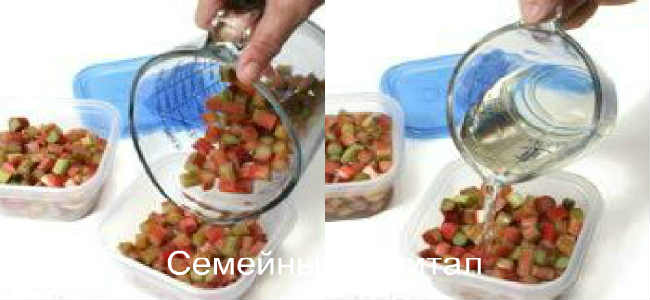 Підготовлений нарізаний шматочками ревінь розкладіть в контейнери або пакети. Але краще цим методом заморожувати в контейнерах. Не заповнюйте ревенем контейнери до самого краю, залиште 1,5-2,0 см вільного місця.