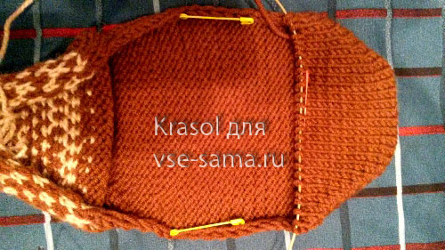 8. В’яжемо підйом носка. Лицьова гладь. Останню петлю ряду в’яжемо 2 разом з кромочной петлею підошви. В особовому ряду – лицьової, в изнаночном ряду – виворітного. Підйом в’яжемо до останньої петлі ступні.