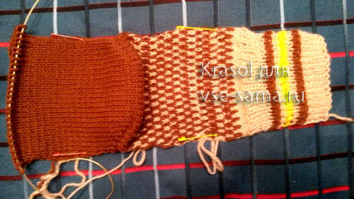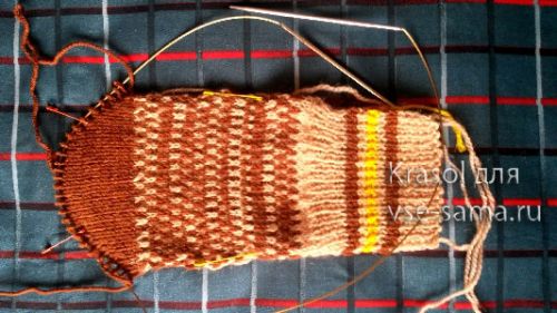 Бежевий колір – основний, додаткові – коричневий і жовтий. Ці кольори будуть надалі використовуватися у в’язанні полотна носка.
